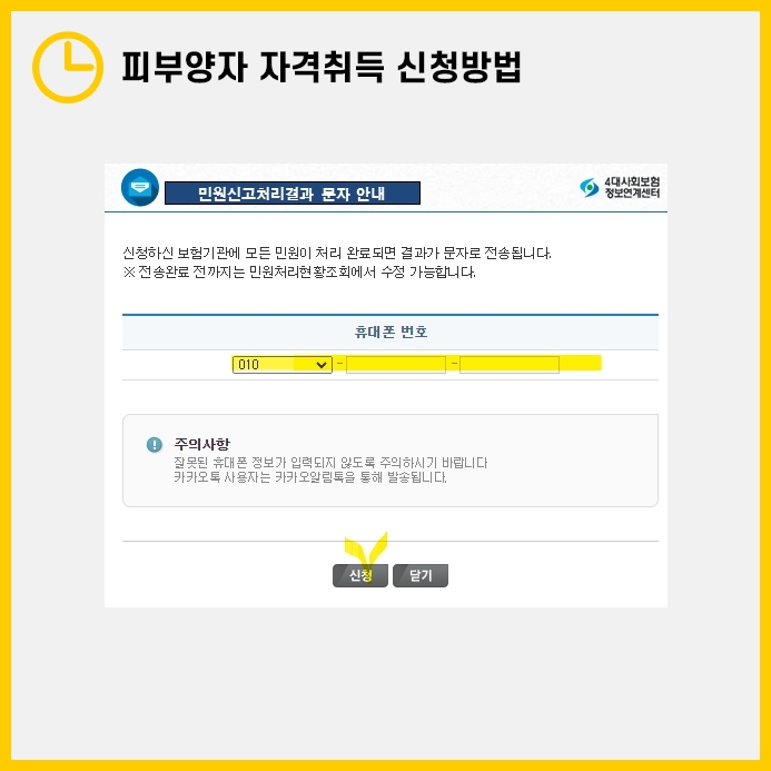 처리결과는 바로 나오는 것이 아니라 영업일 기준 일주일 이내로 연락을 받을 수 있습니다. 확인 연락을 받기위해 연락을 받을 수 있는 휴대폰 번호를 입력한 뒤 신청 버튼을 누릅니다.