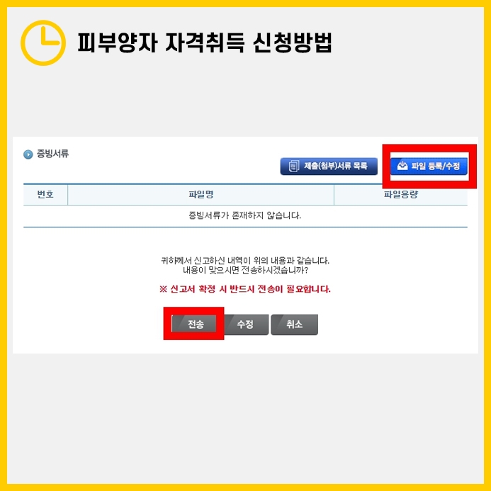 서류 발급이 완료되었다면 이제 '파일 등록/수정'버튼을 눌러 서류를 첨부해 줍니다. 작성한 내용 중 잘못된 정보가 있는지 확인하고 아래에서 '전송'을 눌러줍니다.