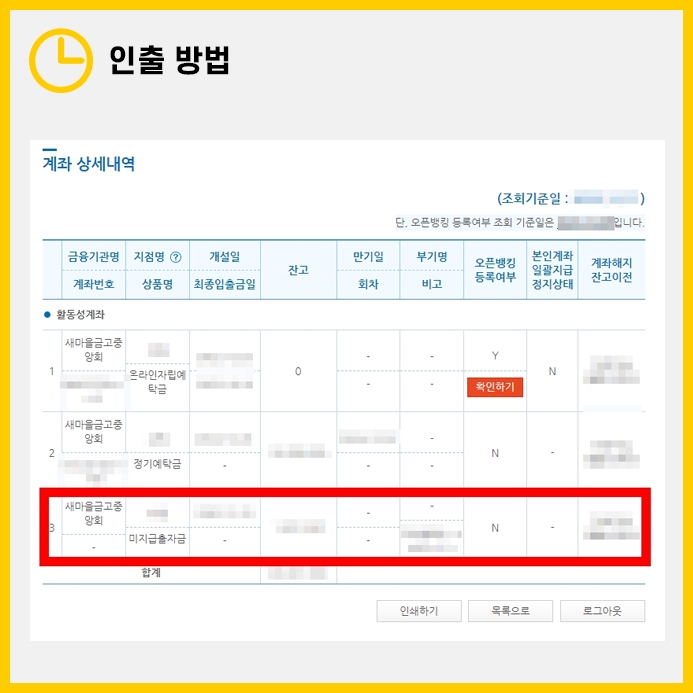 내점 후 은행원의 안내에 따라 진행하면 되며, 별도 수수료는 청구되지 않습니다. 인출받고자 하는 계좌는 반드시 새마을금고일 필요는 없으며 타은행 인출도 수수료가 부과되지 않습니다.