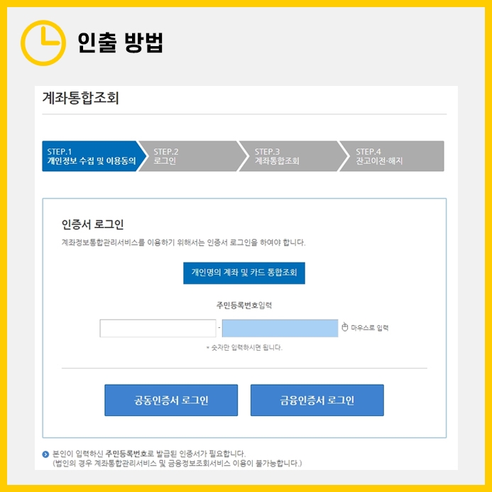 주민등록번호 입력 후 공동인증서나 금융인증서로 로그인합니다.
