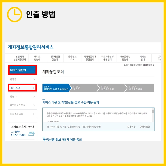 '내계좌 한눈에' 클릭 후 사이트에 로그인하고 '제2금융권'을 선택한 후 동의사항에 동의합니다.