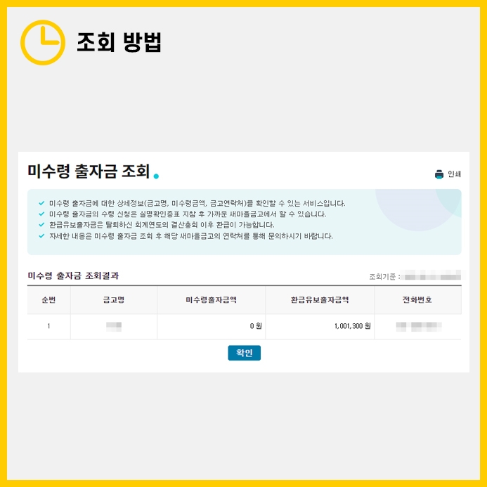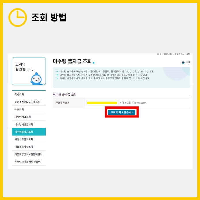 미수령 출자금 조회도 비슷한 방법으로 가능합니다. 주민등록번호 입력 후 본인인증을 진행하여 조회합니다.