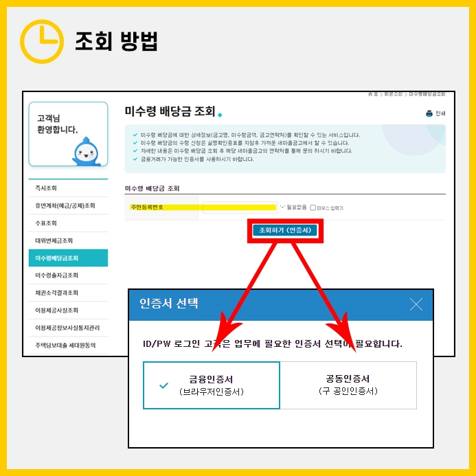 미수령배당금조회를 선택하고 주민등록번호를 입력합니다. 이후 본인인증을 진행하는데 금융인증서, 공동인증서 중에서 선택할 수 있습니다.