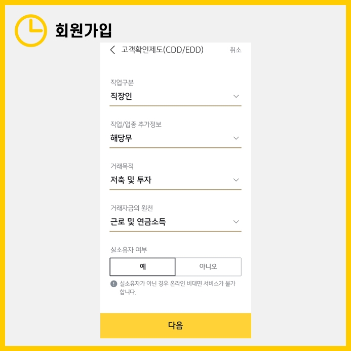 이어서 본인의 직업과 은행을 이용하는 목적, 그리고 거래자금의 원천을 기입합니다.
