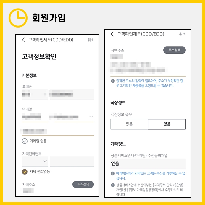 고객확인제도 이행 대상자라면, 은행에 몇가지 개인 정보를 입력해야 합니다. 휴대폰번호, 이메일, 주소, 직장정보 등이 필요하며, 정확한 정보를 입력하여 신속게 진행하도록 합니다.