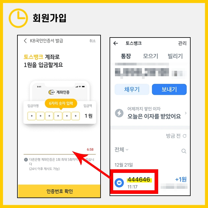 이후, 은행 인증서 발급을 위해 다른 은행의 계좌를 인증합니다. 그럼 입력한 계좌에 1원이 들어오는데, 이때 입금자명에 표시된 6자리 숫자를 정확히 입력합니다.