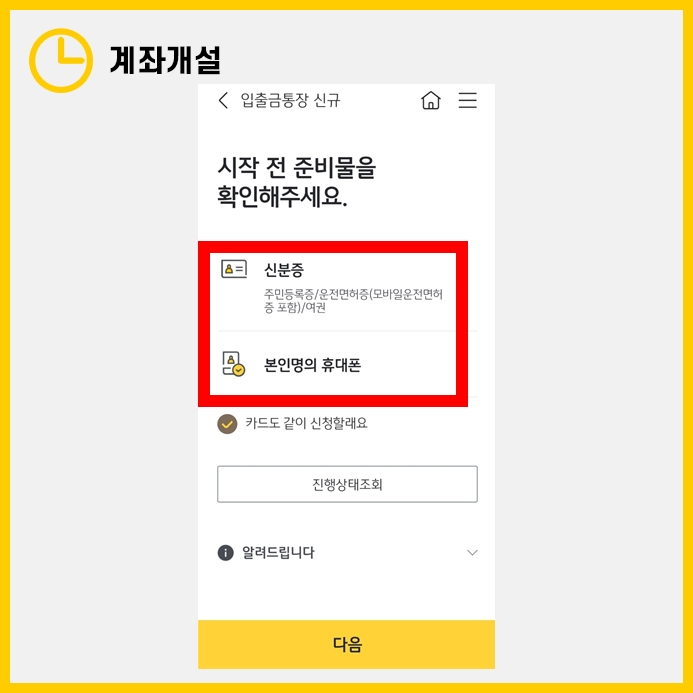 신분증과 본인 명의의 핸드폰이 계좌 개설 시에 필요하며, 이 과정은 회원가입할 때와 동일하기에 설명을 생략하도록 하겠습니다.