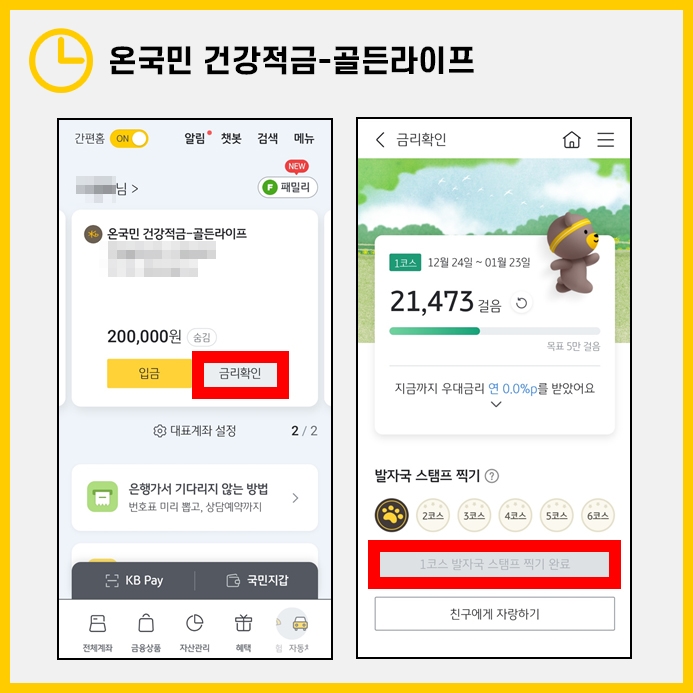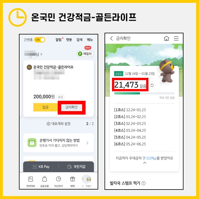 금리확인 화면으로 넘어가 총 6코스의 발자국 스탬프를 달마다 1번씩 누르면 연1%의 금리가 추가됩니다.