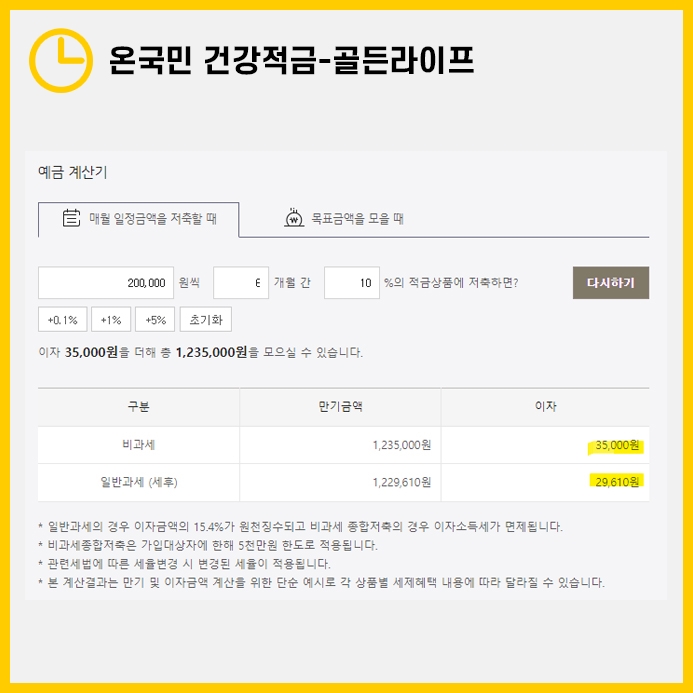 월 20만원씩 6개월 동안 빠짐없이 납입하면, 원금은 총 1,200,000원이 됩니다. 이 경우, 최대 이율이 10%인 '온국민 건강적금-골든라이프'를 통해 비과세(세전) 기준으로는 35,000원의 만기이자를 받게 됩니다.