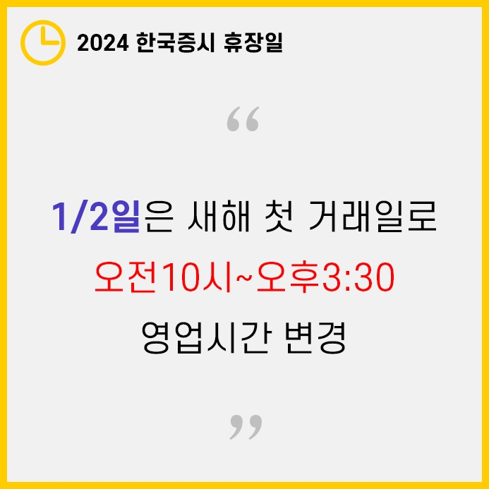 그럼 2024년에 한국증시가 열리지 않는 날과 마지막 거래일에 대해 알아보겠습니다.