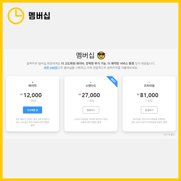 유료 멤버십 플랜에 따라 제공되는 데이터의 양과 종류가 다릅니다. 더 비싼 플랜일수록 더 많은 데이터와 부가 기능을 이용할 수 있습니다. 하지만 일반 블로거라면 베이직 플랜으로도 충분히 블랙키위의 장점을 누릴 수 있습니다.