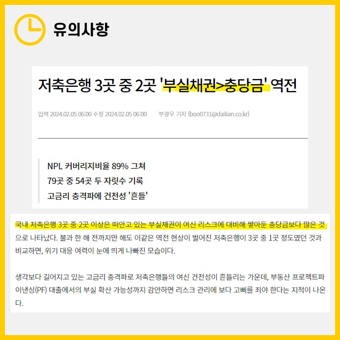 저축은행의 재정건전성이 고금리 충격과 여신건전성 문제, PF대출 부실 등으로 악화되고 있습니다. 최근에는 저축은행 중 3분의 2 이상이 부실채권이 충당금을 초과한다는 보도가 있습니다.