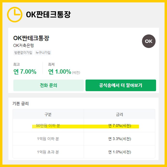OK저축은행의 OK짠테크통장은 연 7%의 높은 금리를 자랑합니다. 하지만 이 금리는 50만원 이하의 예금에만 적용되고, 그 이상의 예금은 금리가 낮아집니다. 50만원 초과부터 1억원 이하까지는 연 3.3%, 1억원 초과부터는 연 1%의 금리를 받게 됩니다.