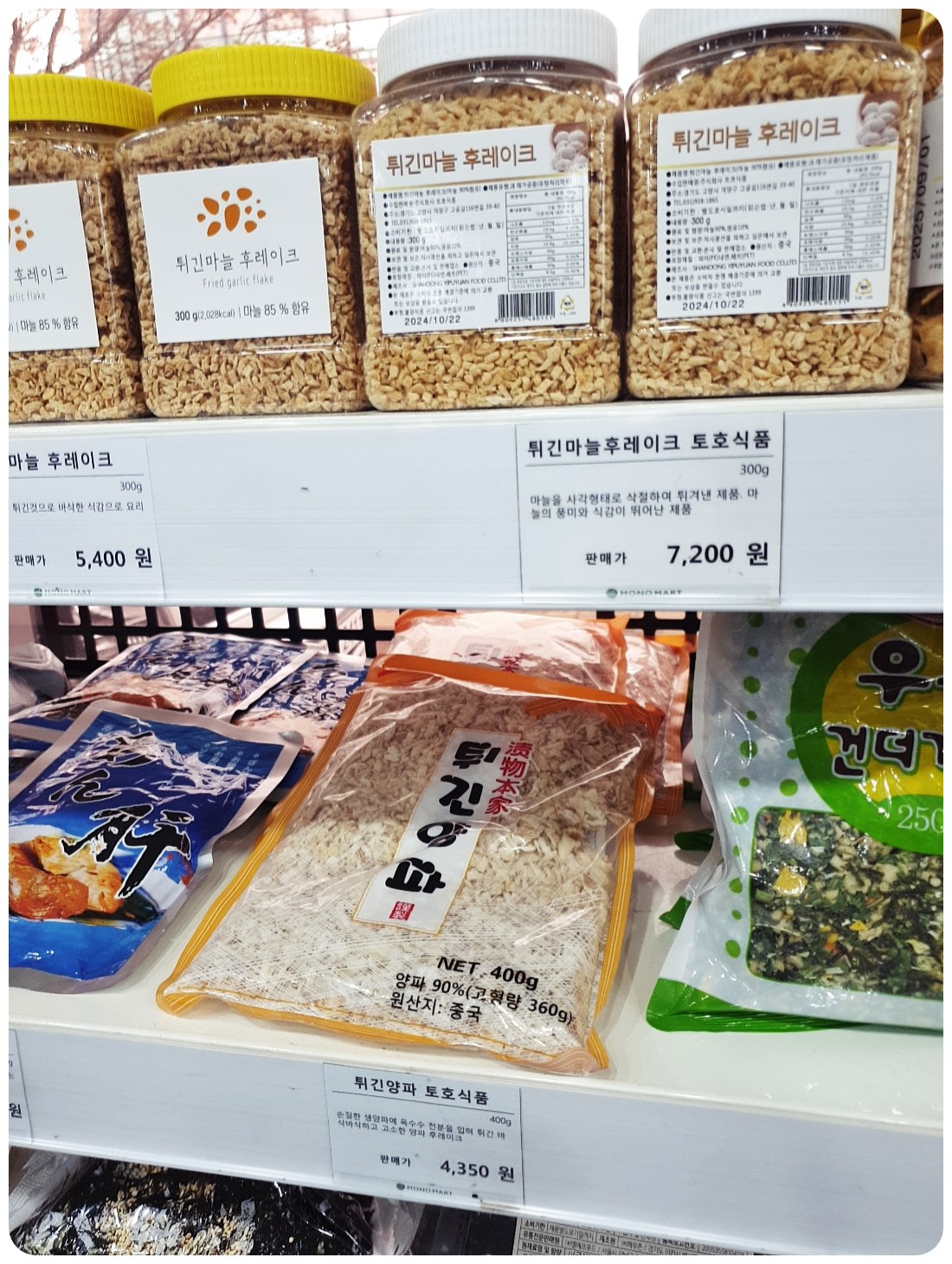 여덟 번째, 튀긴마늘 후레이크(5,400원)와 튀긴양파(4,350원)입니다. 이것들은 요리에 넣으면 향과 맛이 살아나는 식자재예요.