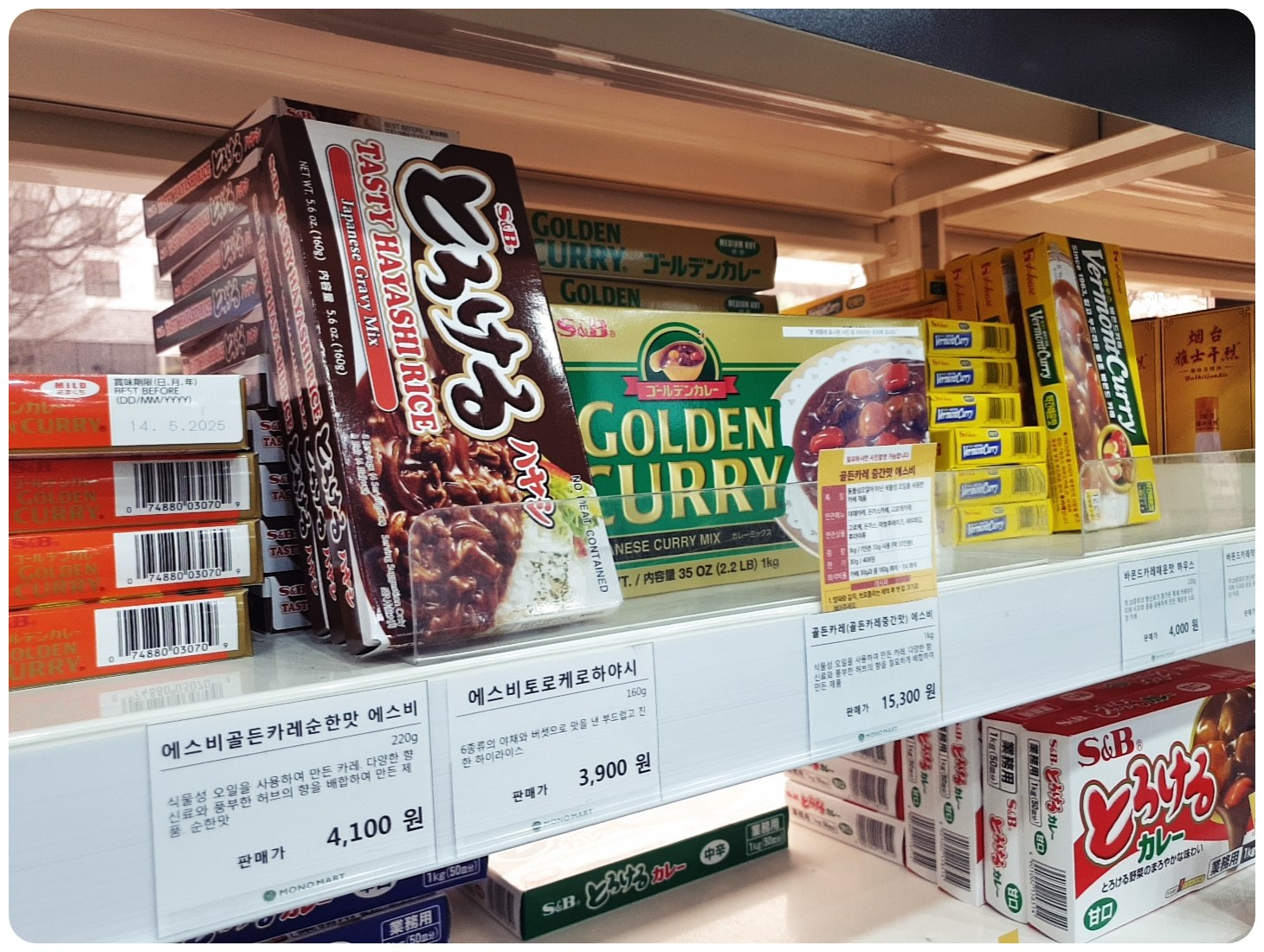 네 번째로, 카레와 하이라이스 등의 소스입니다. 이곳에서는 골든카레(15,300원)와 하이라이스(3,900원) 같은 일본식 카레와 소스도 팔고 있어요.