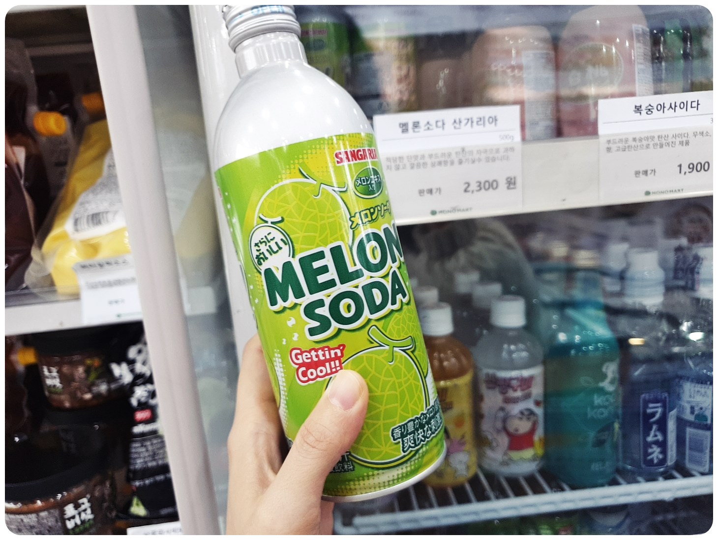 일곱 번째, 메론소다(2,300원)입니다. 이건 저의 최애 음료인데, 이곳에서도 구할 수 있어서 기뻤어요.