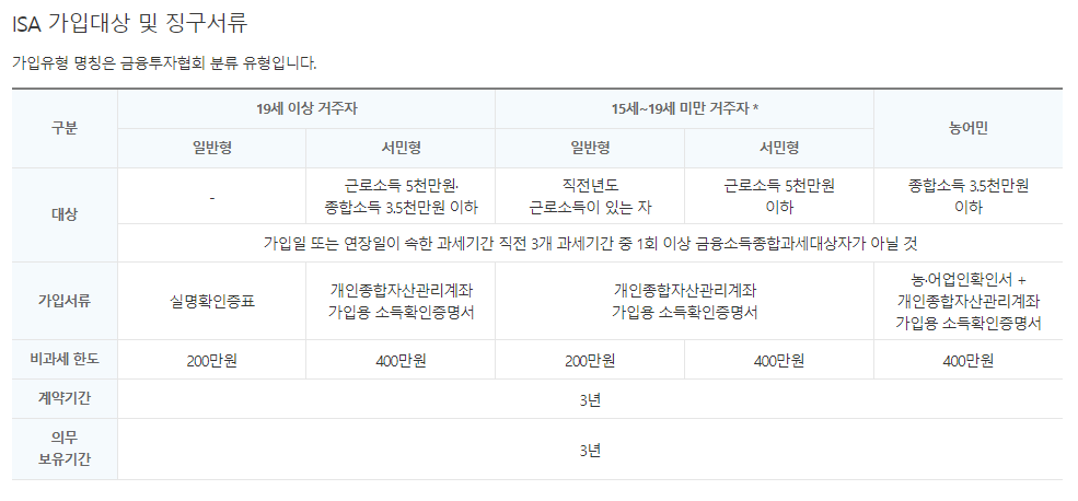 이는 가입시 19세 이상 거주자면 가입이 가능하고, 납입한도는 연 2,000만원으로 의무 보유기간은 3년입니다.