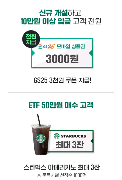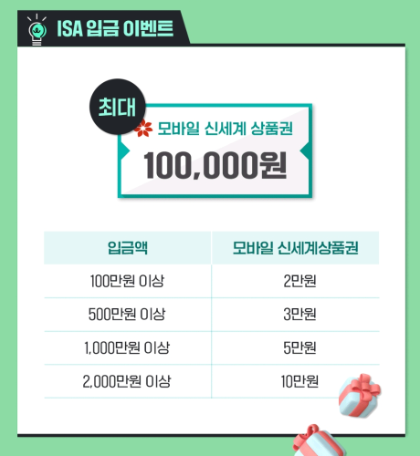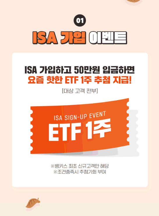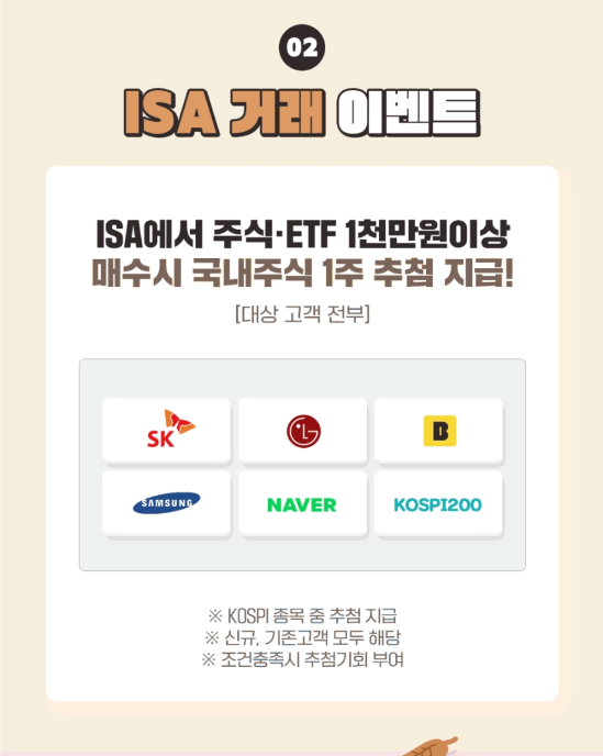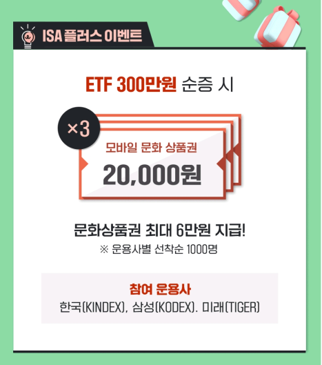 ISA를 가입하면 우대수수료 혜택뿐만아니라 ETF 1주 추첨, 모바일 상품권 증정 등의 이벤트가 있으니 이럴때 개설해두시면 더욱 많은 혜택을 누리실 수 있습니다.