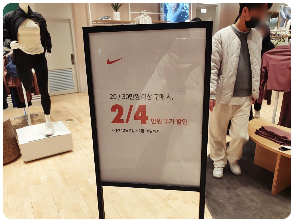 나이키 매장에 들어가보니 20만원, 30만원 이상 살 때 2만원, 4만원씩 더 할인해주는 이벤트를 하고 있었습니다. 2월 9일부터 18일까지라고 하니 세일 기간을 놓치지 마세요.