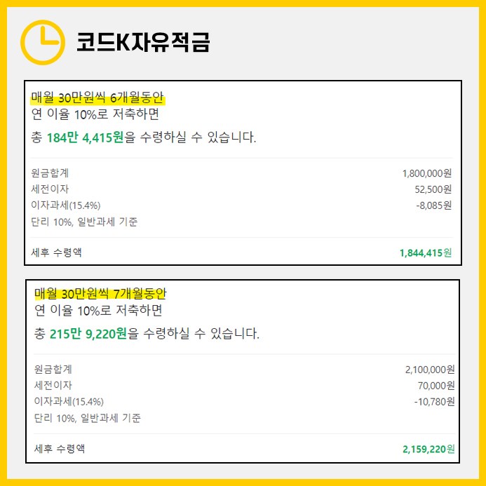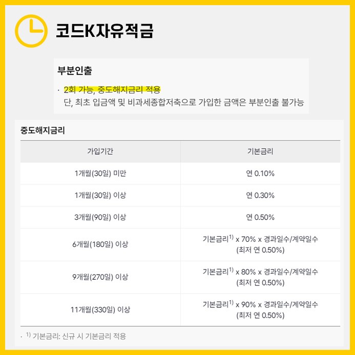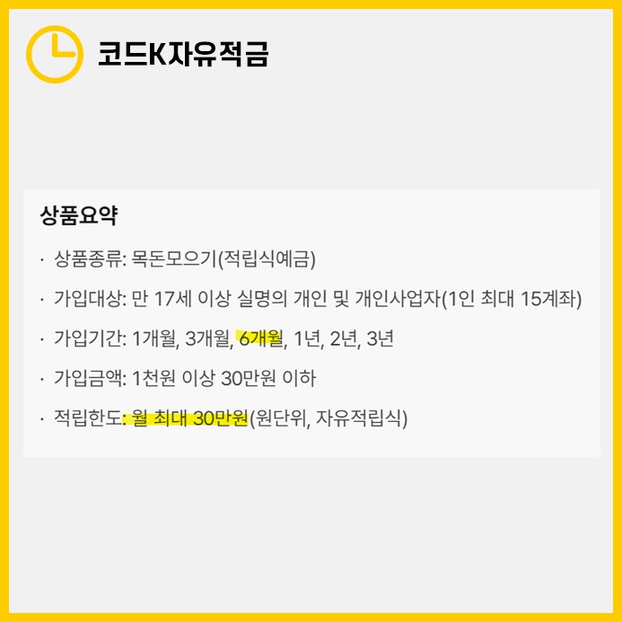 코드K자유적금은 중도 인출이 가능한 두 번의 기회를 제공하는 것이 큰 장점입니다. 6개월 동안 매월 30만원을 납입하는 것이 부담스러우신 분들에게 유용한 정보가 될 것입니다.