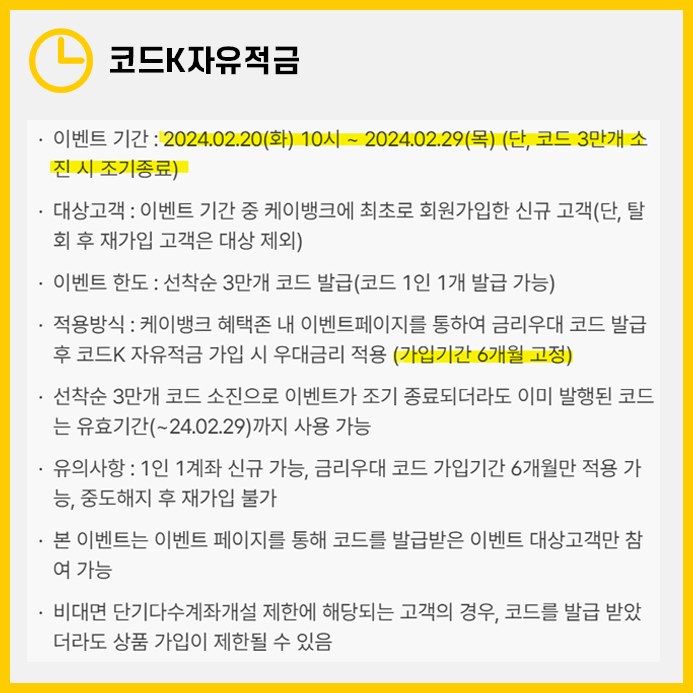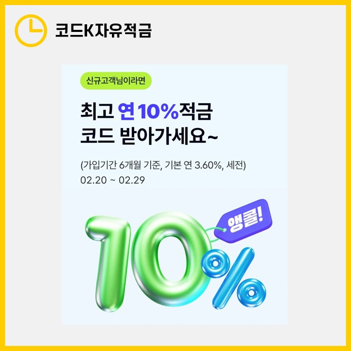 이번 이벤트는 2024년 2월 20일 오전 10시부터 2월 29일 목요일까지 진행되며, 선착순 3만 계좌에 한해 제공됩니다. 이 기간 내에 신규 가입하고 우대 이자율 코드를 받아 6개월 단기 적금에 가입하면 연 10%의 이자율을 적용받을 수 있습니다.