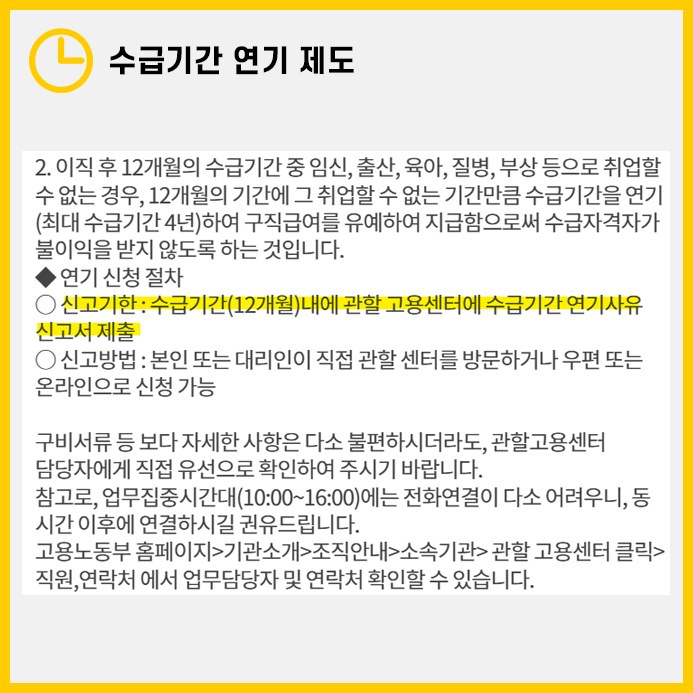 이직 후 12개월 동안은 실업급여 수급기간으로 설정되며, 질병, 부상, 임신, 출산, 육아 등으로 인해 취업이 불가능한 상황이라면 최대 4년까지 수급기간을 연기할 수 있습니다. 이는 미래에 실업급여를 신청할 수 있도록 하는 유예 조치입니다.
