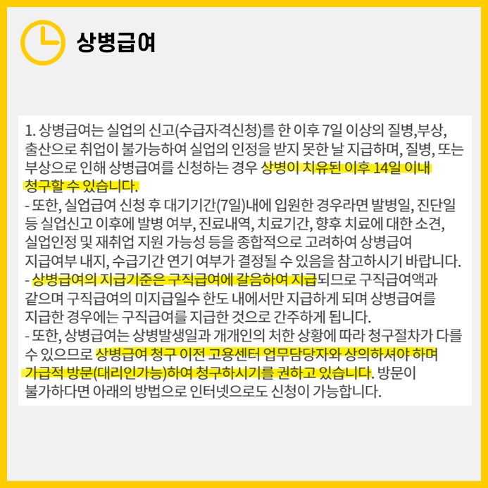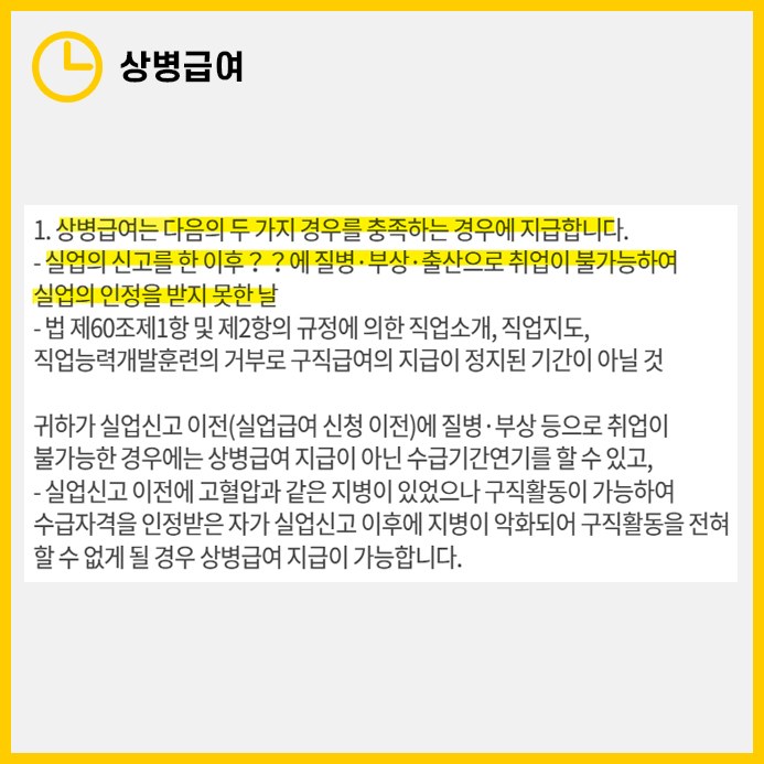 실업급여 지원금수급 중 질병이나 부상, 혹은 출산으로 인해 구직 활동이 어려워진 경우, '상병급여'를 신청할 수 있습니다. 상병급여의 주요 조건은 다음과 같습니다:
