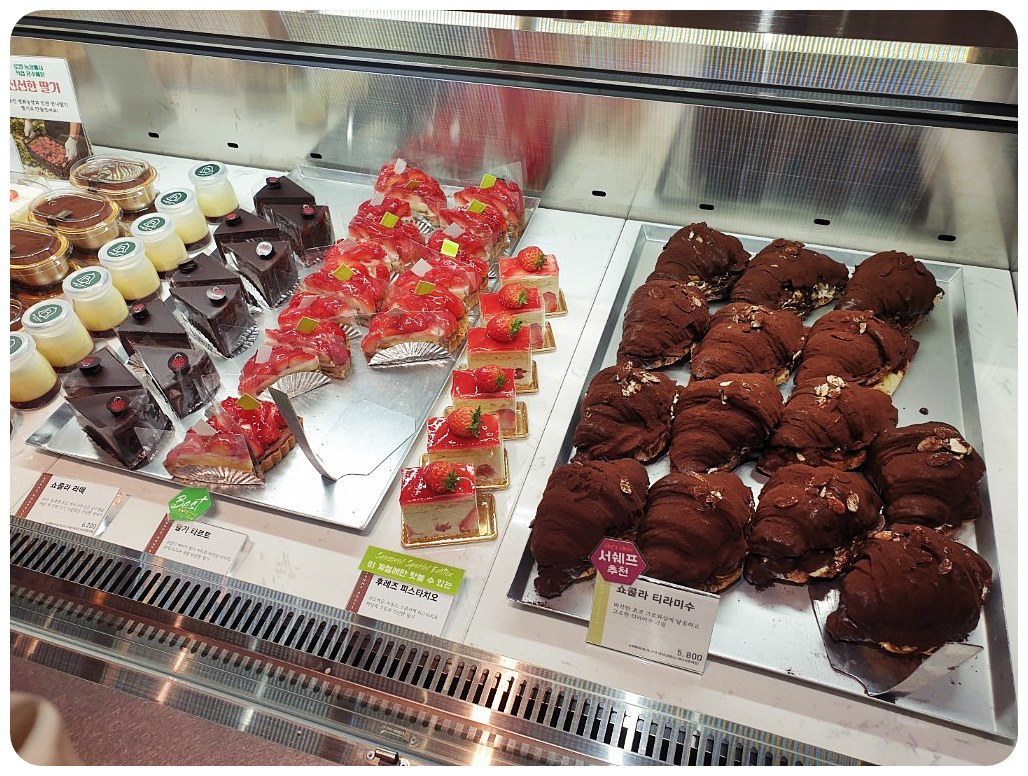 냉장 코너에서는 푸딩, 티라미수, 타르트, 케익 등 다양한 종류를 판매하고 있으며, 특히 쇼콜라 티라미수가 매우 맛있어 보입니다.