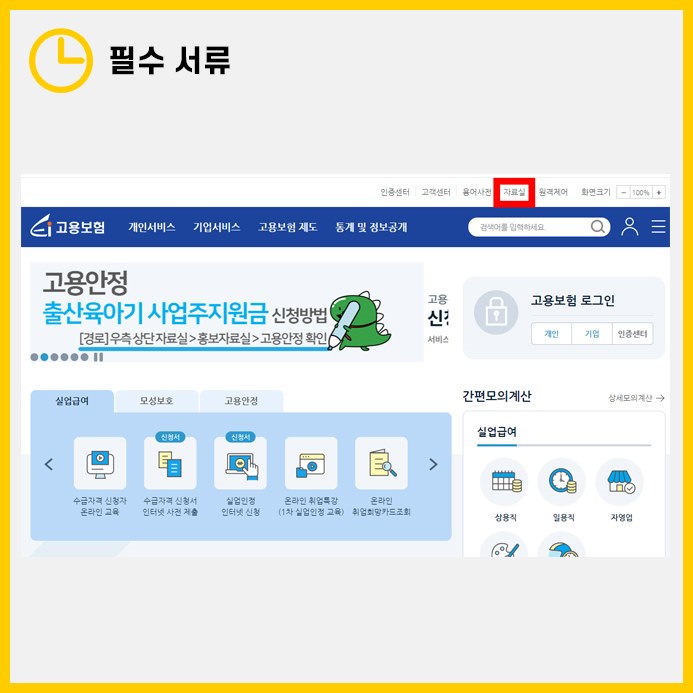 별도의 양식이 필요한 경우, 고용보험 홈페이지에서 다운로드할 수 있습니다. 홈페이지 상단의 '자료실' 메뉴를 클릭합니다.