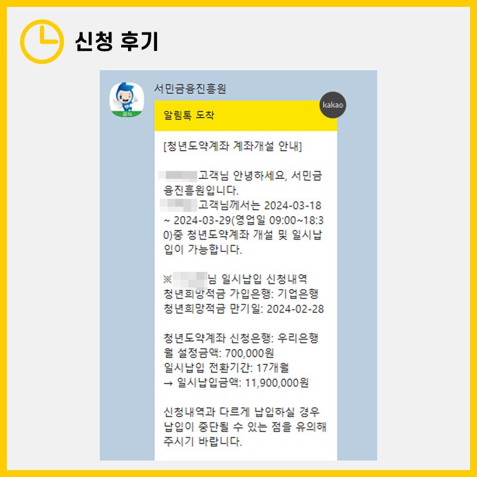 신청 후 약 2주가 지나면, 서민금융진흥원으로부터 가입 가능하다는 알림톡을 받게 됩니다. 이후 영업일에 맞춰 우리은행 애플리케이션을 통해 가입 절차를 완료했습니다.