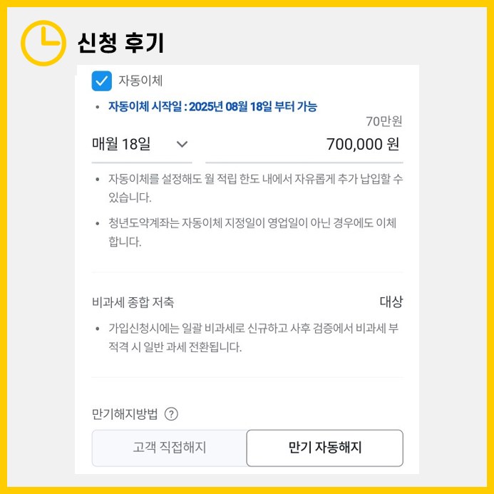 저는 자동 이체 날짜로 가능한 가장 빠른 날짜를 선택했으며, 만기 시 자동 해지를 선택했습니다. 만기가 되면 금리가 절반 이하로 감소하여 계좌를 유지할 이유를 느끼지 못했습니다.