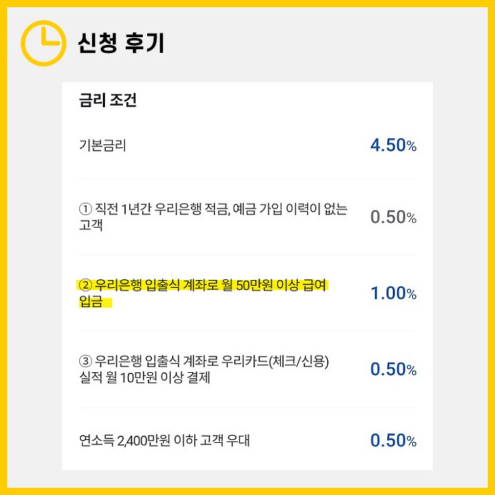 우리은행의 경우, 우대금리는 최대 1%까지 적용됩니다. 월 50만원 이상의 급여를 우리은행 입출금 계좌로 이체하면 이 조건을 만족시킬 수 있습니다. 일반적으로 입금자 명에 '월급', '급여' 등의 단어가 포함되어 있다면, 우대금리 조건을 충족하는 것은 어렵지 않습니다.