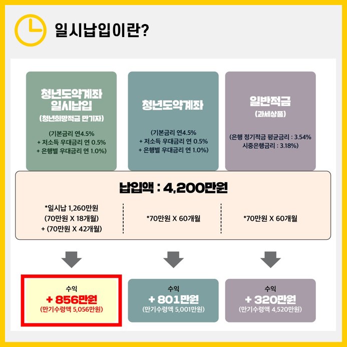 이러한 일시납입 옵션을 선택하면, 동일한 금리 조건에서도 더 많은 수익을 기대할 수 있습니다. 예를 들어, 일시납입을 하지 않았을 경우 최대 ₩8,010,000의 수익을 얻을 수 있지만, 일시납입을 통해 ₩8,560,000까지, 즉 추가로 ₩550,000을 더 얻을 수 있게 됩니다.