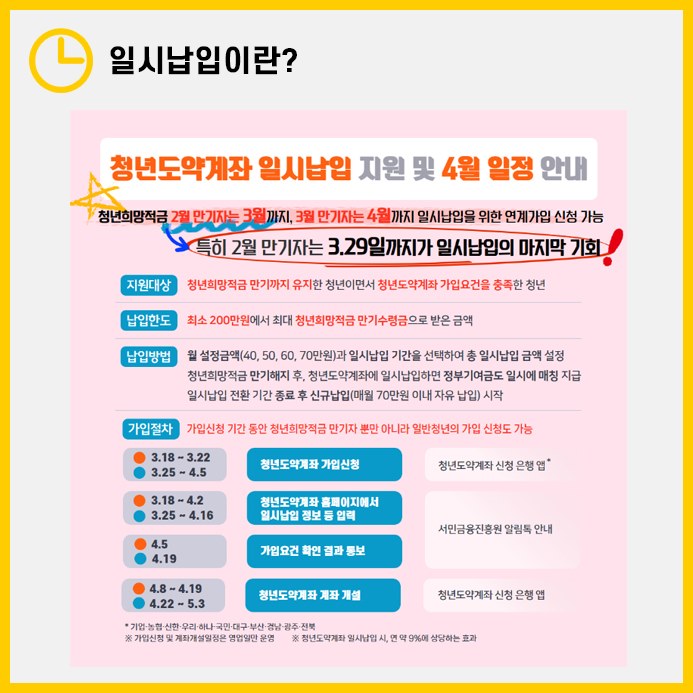 최근 청년 지원 정책인 청년희망적금이 만기되면서, 청년도약계좌에 가입할 기회가 생겼습니다. 이때 서민금융진흥원에서 일시납입제도를 선택할 수 있다는 소식을 듣고, 이 방법을 이용하기로 결정했습니다.