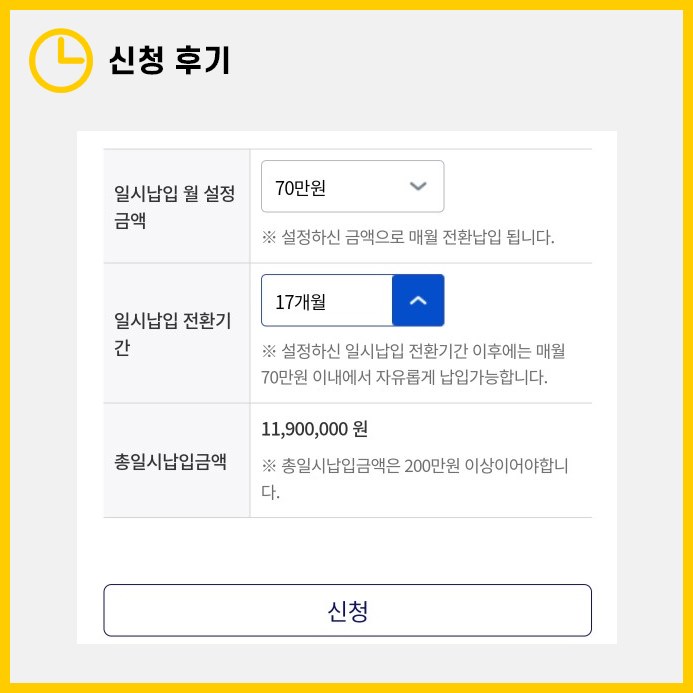 처음에는 일시납입을 하면 5년 동안 월 70만원씩 납입을 계속해야 하는지 궁금했습니다. 하지만 일시납입을 선택하면, 예를 들어 월 70만원씩 17개월분을 일시납입 신청했다면, 그 17개월 동안은 추가적인 월 납입금을 납부하지 않아도 된다는 것을 알게 되었습니다.