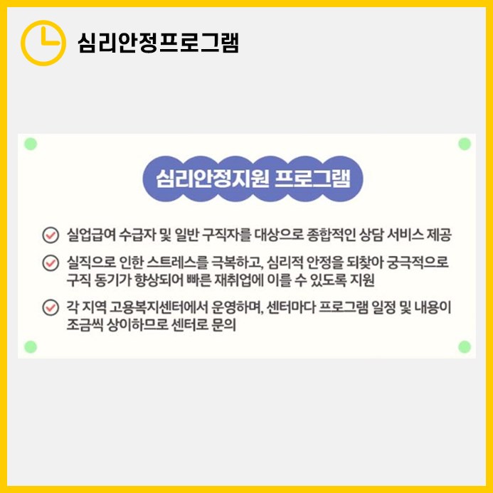 실업급여 수급자를 위한 심리 안정 지원 프로그램은 구직 중인 분들에게 심리적 지원을 제공합니다. 이 프로그램은 심리적 어려움을 겪으며 일자리를 찾는 과정에 있는 분들에게 유익할 수 있습니다.