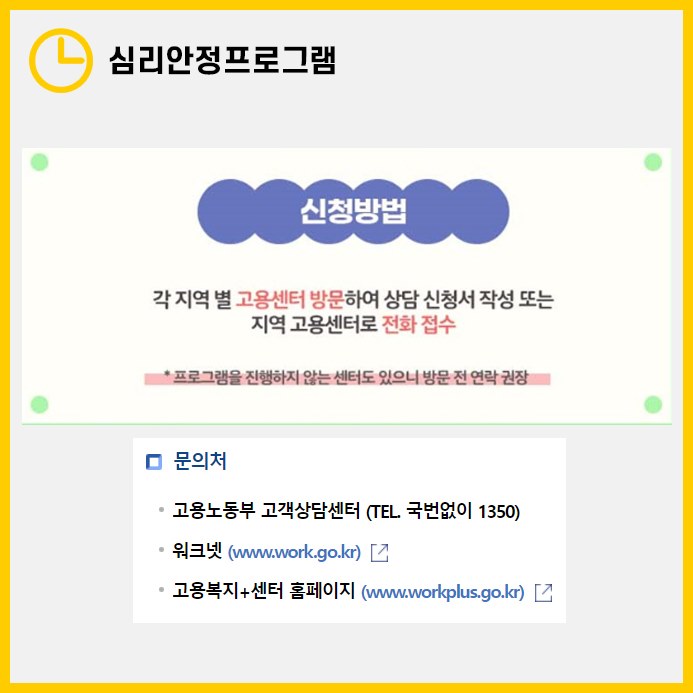 심리 안정 프로그램에 관한 궁금증이 있으시다면, 고용노동부의 고객 상담 번호인 1350번으로 문의하실 수 있습니다. 모든 지역에서 이 프로그램을 운영하는 것은 아니므로, 방문 전에 전화로 확인하시는 것이 좋습니다. 이렇게 하면 불필요한 방문을 피하고, 프로그램에 대한 자세한 정보를 미리 알 수 있습니다.