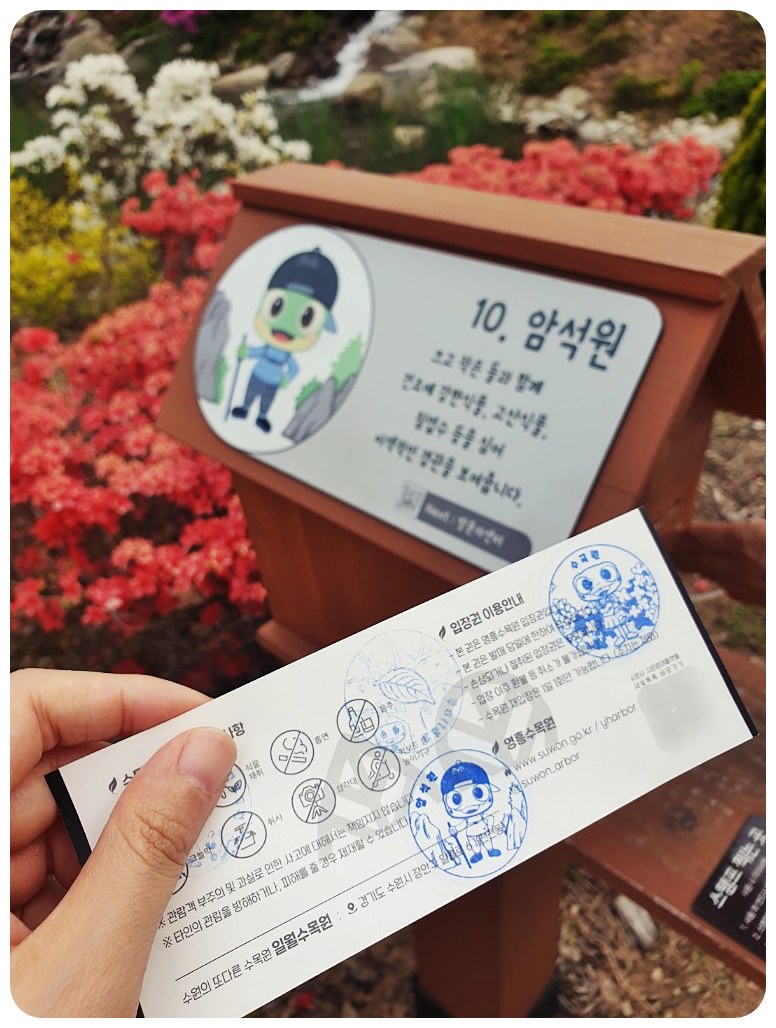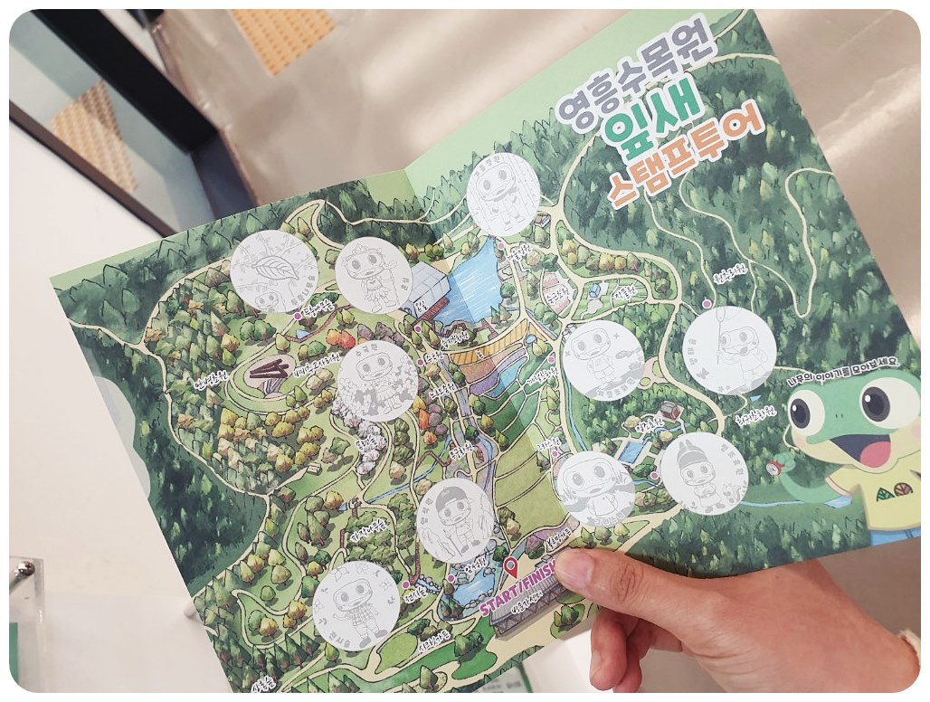 수목원을 방문하실 때는 매표소 옆에서 팜플렛을 꼭 챙기시길 바랍니다. 이 팜플렛에는 스탬프를 찍을 수 있는 구역이 표시되어 있어요.