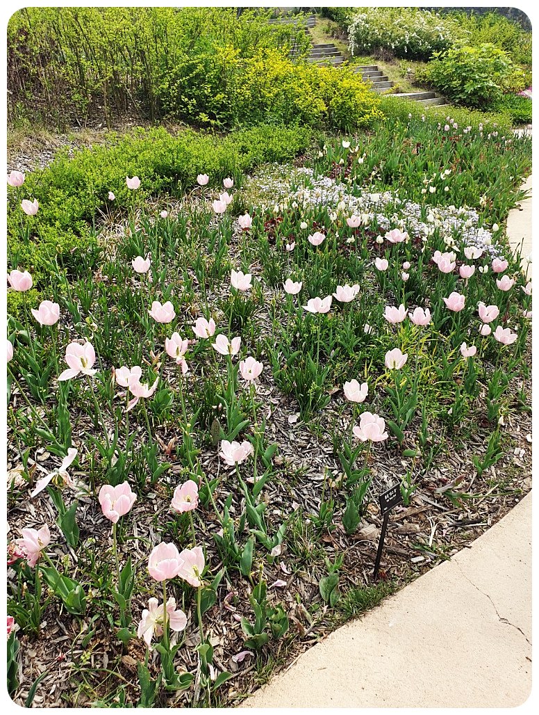 비록 튤립은 계절의 끝자락에 방문하여 많이 지고 없었지만, 여전히 남아있는 분홍색 튤립이 아름다움을 더해주었어요.