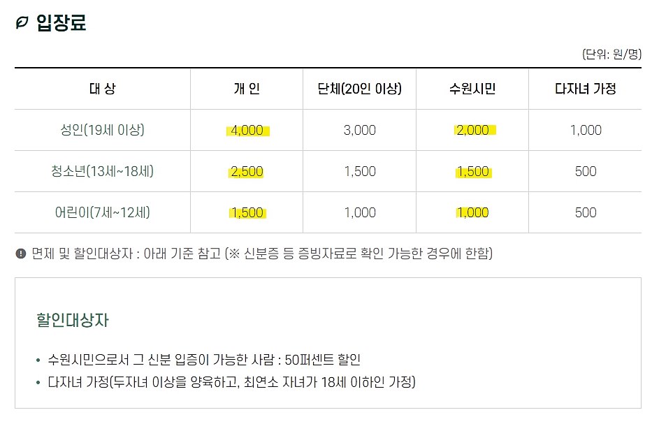 수원에 거주하시는 분들에게는 영흥수목원 방문이 더욱 경제적입니다. 신분증을 제시하면 입장료가 반값으로 할인되어, 성인은 단돈 2,000원에 이용할 수 있어요. 수원의 시민이시라면 이 기회를 놓치지 마세요.