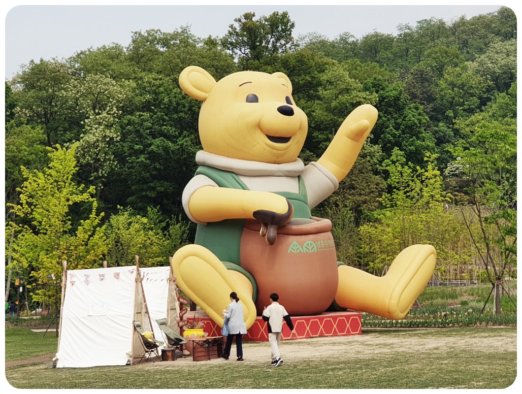 수목원에 들어서자마자, 거대한 곰돌이 푸 조형물이 반겨주었어요. 사진 찍기에 정말 좋은 포인트였죠.