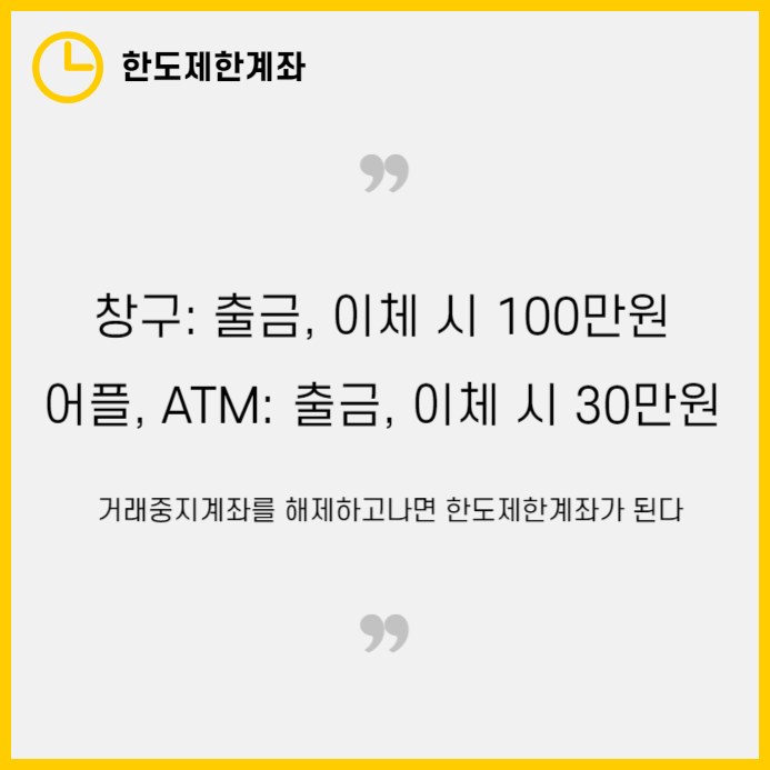 한도제한계좌는 특정 조건 하에 입출금 가능 금액에 제한이 있는 계좌를 말합니다. 적절한 서류 제출 후 복구된 계좌는 다음과 같은 한도가 설정됩니다.