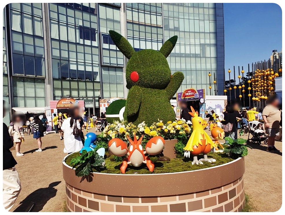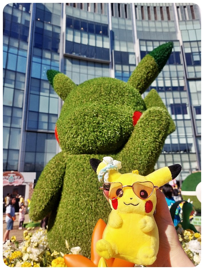 광장에 들어서자마자, 거대한 피카츄 토피어리가 눈에 띄었습니다. 친구가 가져온 피카츄 인형과 함께 기념사진을 찍었는데, 너무 귀여웠어요! 다음에는 제 포켓몬 인형도 가져와야겠다고 생각했습니다.