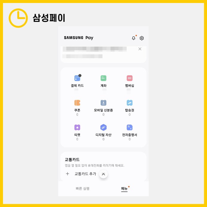 삼성페이 앱을 이용하여 신한 체크카드를 교통카드로 등록하는 방법을 새롭게 안내해 드리겠습니다. 먼저, 삼성페이 앱의 메뉴에서 '교통카드 추가' 옵션을 선택합니다.