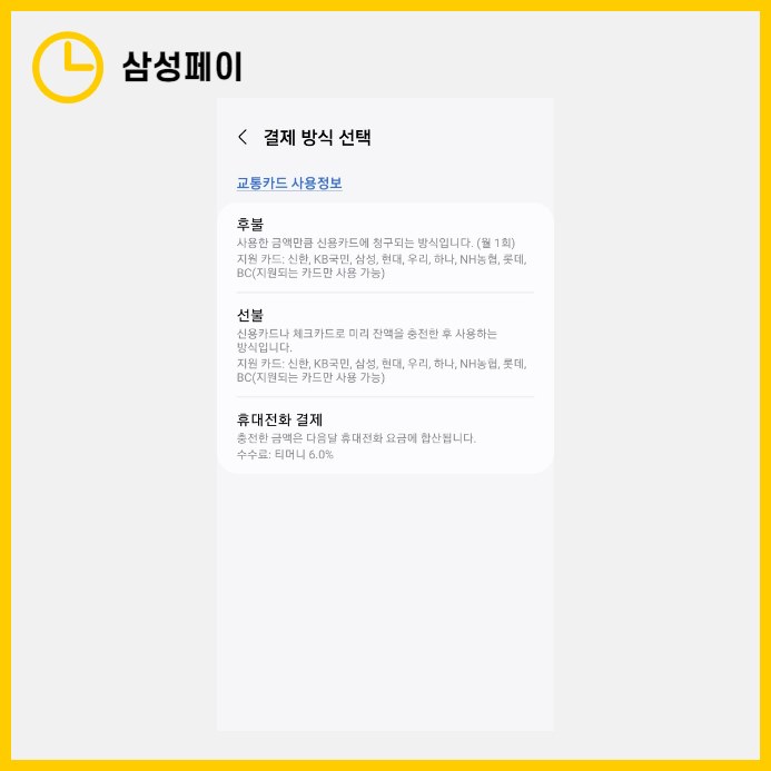 선불카드나 휴대전화 결제에 비해 후불결제 방식은 수수료가 없다는 장점이 있습니다.