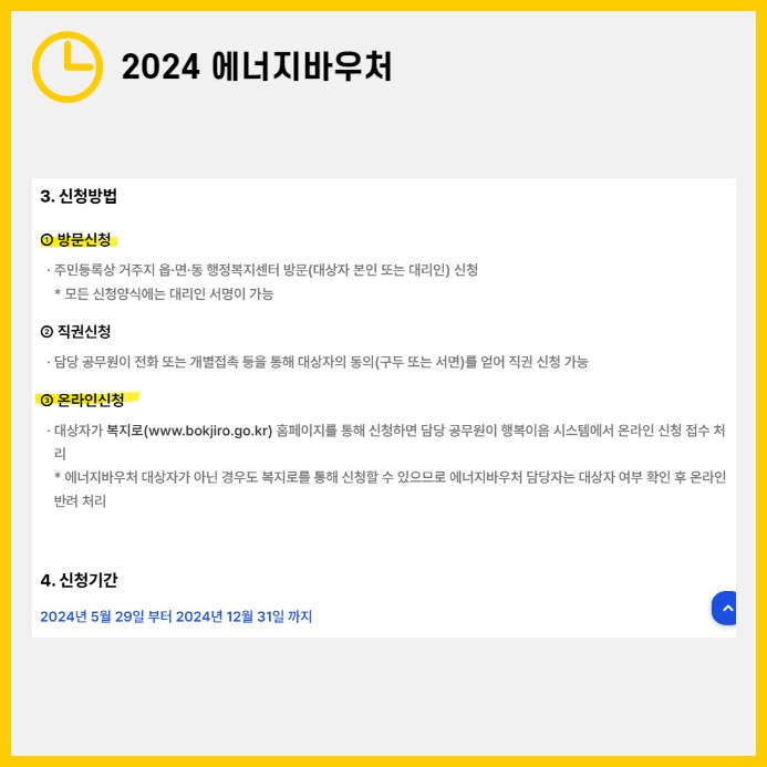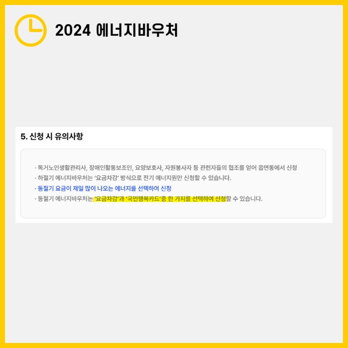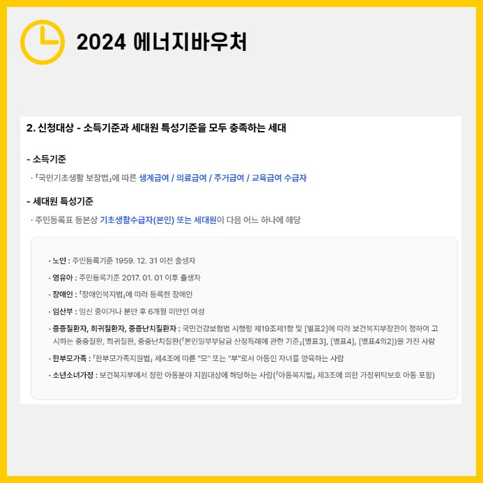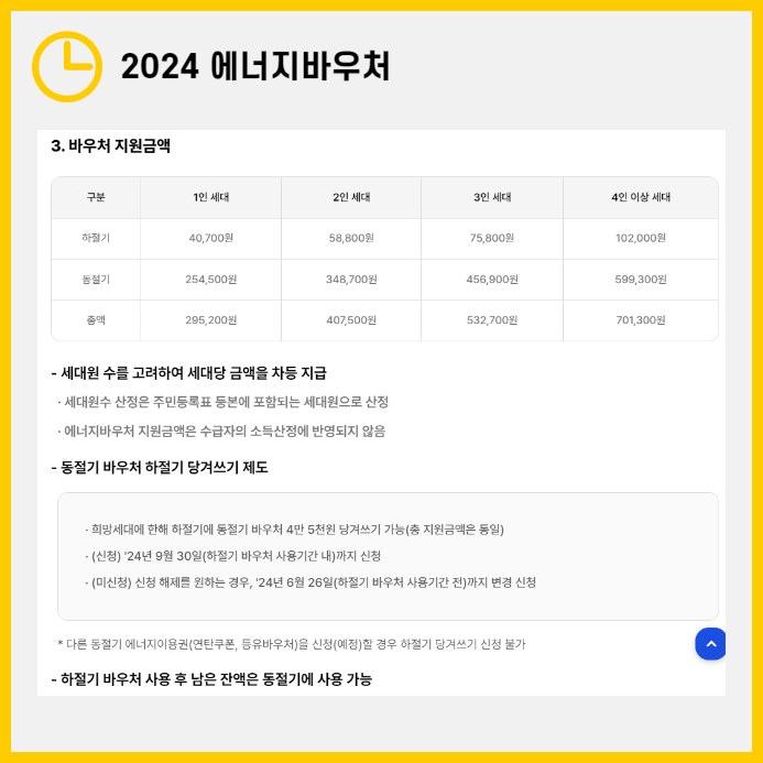 신청자는 본인 또는 세대원이 이러한 특성 중 하나에 해당되어야 합니다. 하절기 바우처는 2024년 7월 1일부터 9월 30일까지, 동절기 바우처는 2024년 10월 1일부터 2025년 5월 25일까지 사용할 수 있습니다.
