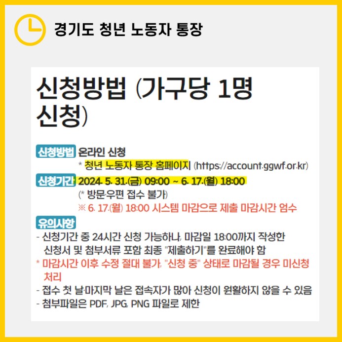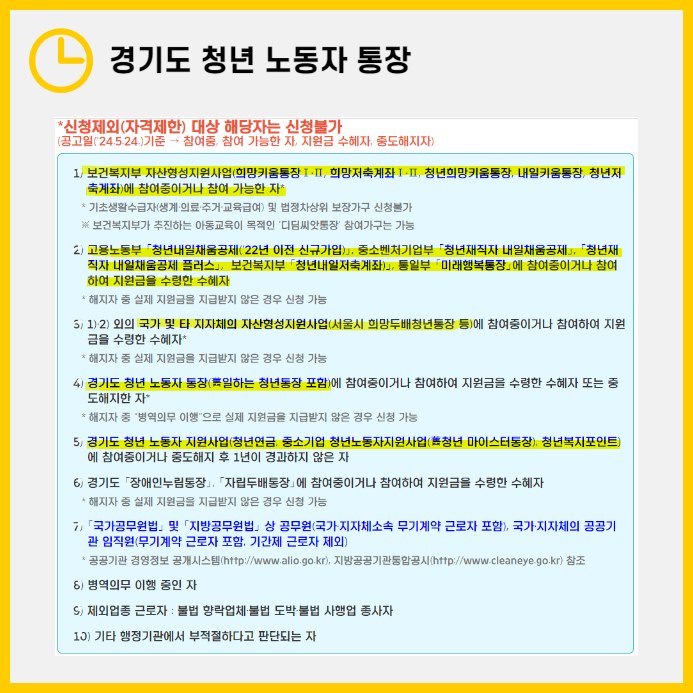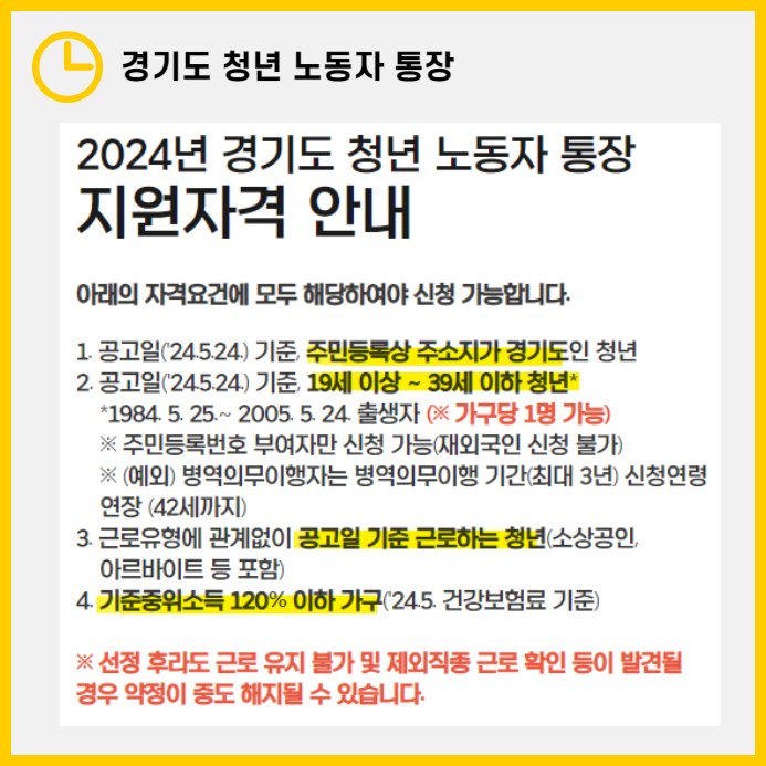대부분의 청년 정책들의 소득 기준은 충족하기 굉장히 쉽지만, 경기도 청년 노동자 통장의 경우엔 해당되지 않는 분들도 있으리라 생각됩니다. 그만큼 본 혜택이 필요한 청년들에게 지원금이 갈 수 있는 것으로 여겨집니다.