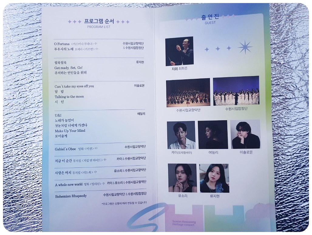 이날 공연 라인업은 수원시립교향악단과 수원시립합창단, 류지현, 이솔로몬, 에일리, 그리고 카이와 유소리로 구성되었습니다. 예전에도 수원 헤리티지 콘서트를 관람한 적이 있지만, 2024년의 라인업은 예년에 비해 다소 아쉬운 느낌이 들었습니다. 올해 수원시의 예산이 작년에 비해 삭감된 탓인지 전체적인 축제의 규모가 줄어든 듯했습니다.