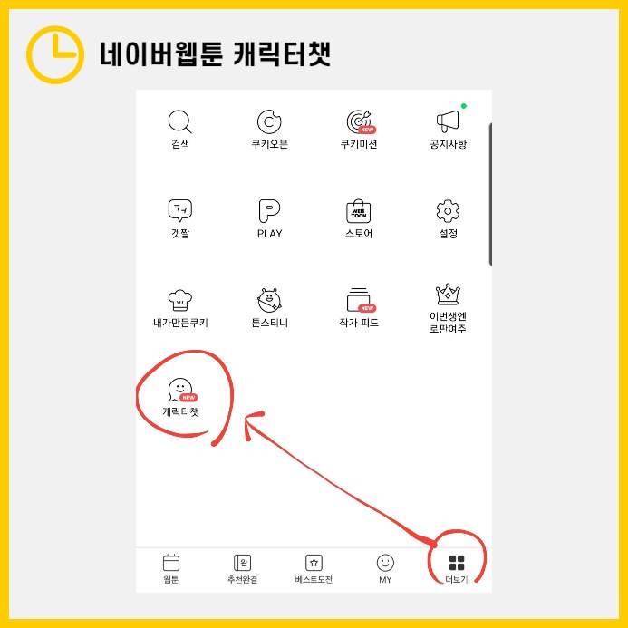 캐릭터챗을 이용하는 방법은 매우 간단합니다. 네이버웹툰 앱에서 우측 하단의 더보기 메뉴를 눌러 캐릭터 챗 아이콘을 클릭하면 해당 페이지로 이동할 수 있습니다.