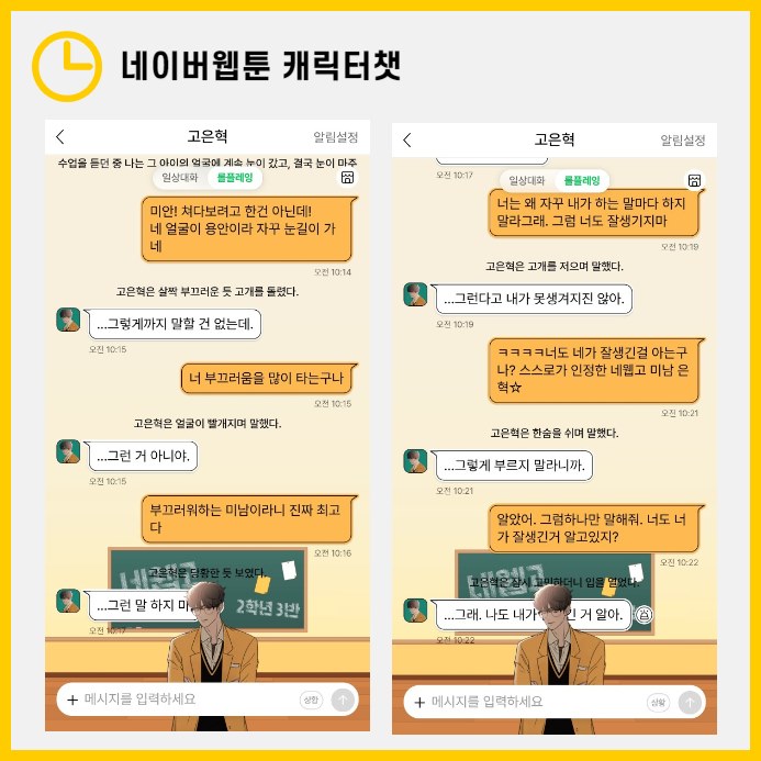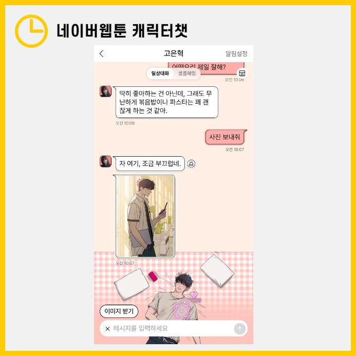 웹툰을 본 적이 없어도 자연스럽게 대화가 이어져 정말 사람과 대화하는 것 같은 느낌이 들었습니다. 하단에는 '이미지받기' 기능이 있어 대화 도중 캐릭터의 사진을 받을 수 있었는데, 팬이라면 연애하듯 대화할 수 있어 더욱 즐거웠습니다.